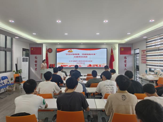 火红六月,党旗飘扬;初心不改,志在山海。为深入贯彻党纪学习教育,切实强化思想引领,提升党员纪律意识,强化毕业生党员的使命感和责任感。6月20日下午,yl23455永利集团土木与路桥工程系本科生党支部在综合实验楼12G401开展“学党纪知敬畏,守诚信铸未来”主题党日活动。支部书记苏朗主持本次活动。