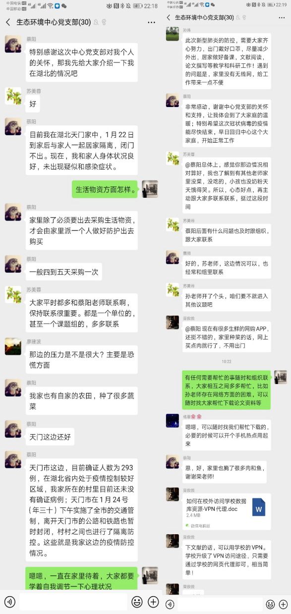 活动开始后仍然身在湖北省天门市的蔡阳同志首先跟全体党员分享了其在湖北省的状态,并感谢组织和中心的关心,支部老师也纷纷对其在生活物资、心理状态等方面表示了关心和问候,同时蔡阳同志也对天门市的整体情况跟大家进行了分享,以方便各党员清楚了解当地的疫情防控情况。