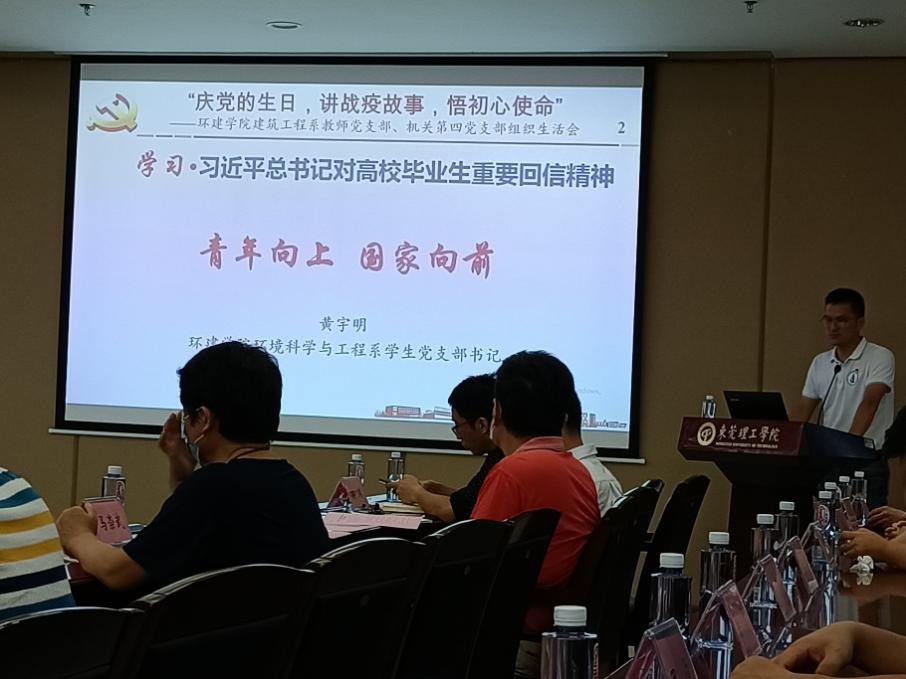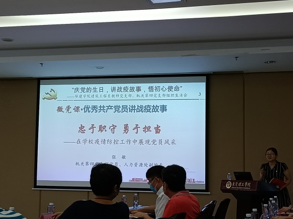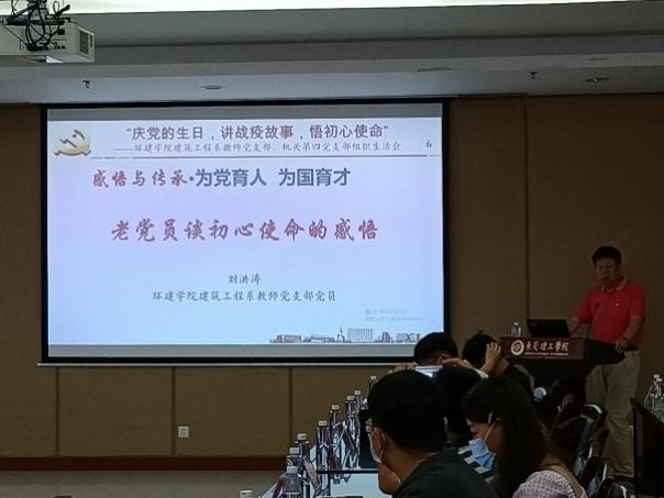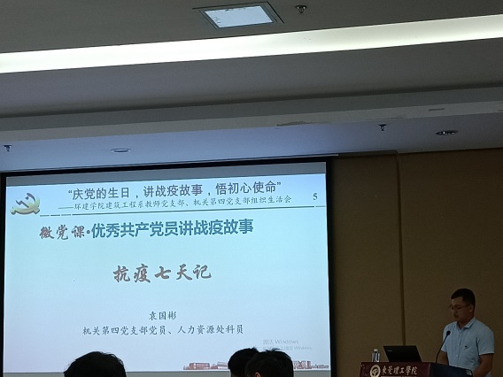 为庆祝中国共产党成立99周年,表达对党的忠诚与热爱,同时向抗疫优秀典型学习,更好地落实立德树人根本任务,7月15日下午,机关第四党支部和环建学院建筑工程系教师党支部开展主题为“庆党的生日,讲战役故事,悟初心使命”结对共建组织生活会。会议由环建学院党委书记李纠主持。机关第四党支部党员、建筑工程系教师党支部党员,环建学院部分党委委员参加会议。