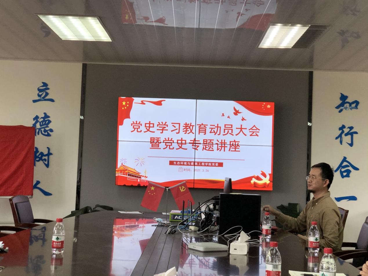 3月26日下午,yl23455永利集团在12K205召开教工党员党史学习教育动员大会。会后邀请马克思主义学院党委副书记郭奕鹏博士开展以“习近平关于中国共产党历史的重要论述”为主题的讲座。本次活动由环建学院党委副书记诸小妮老师主持,环建学院全体教工党员参加了活动。