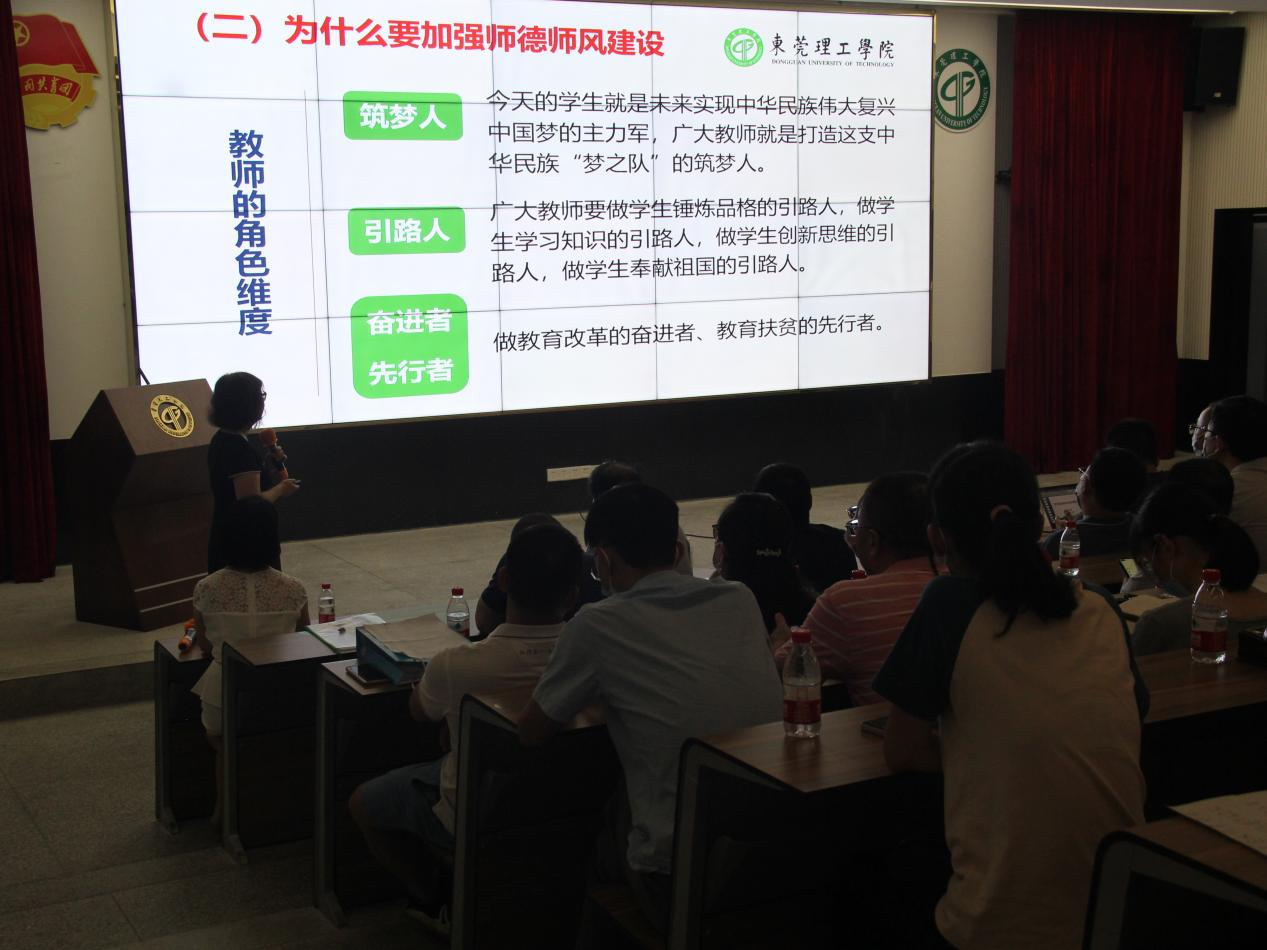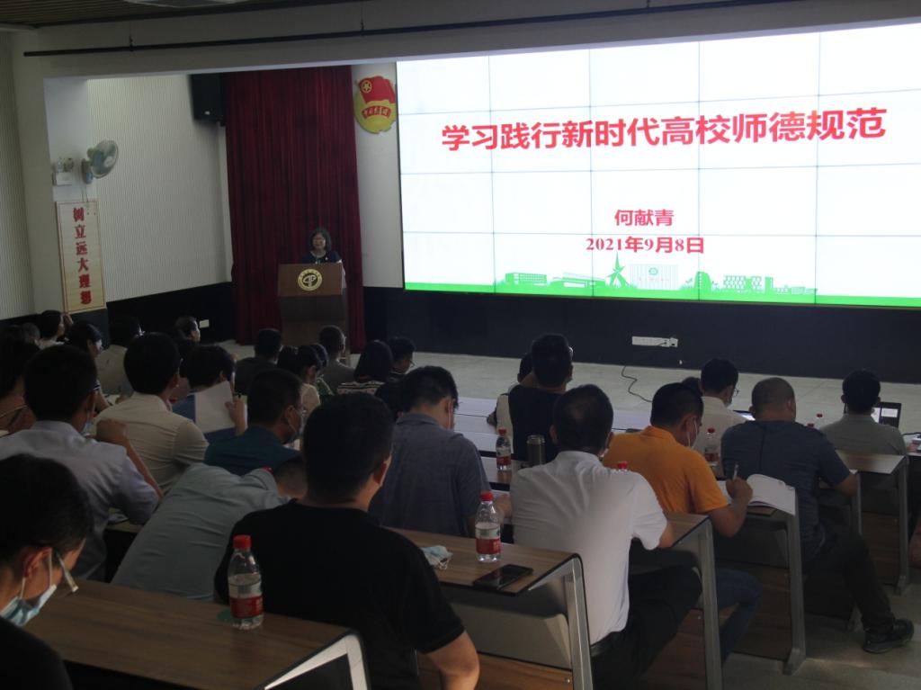 党委教师工作部部长、机关第四党支部书记何献青做了“学习践行新时代高校师德规范”的主题讲座。何献青带领大家深入学习了习近平总书记关于师德师风的论述,以校内外师德失范案例开展警示教育,带领大家共同学习新时代高校教师职业行为十项准则,筑牢思想防线。