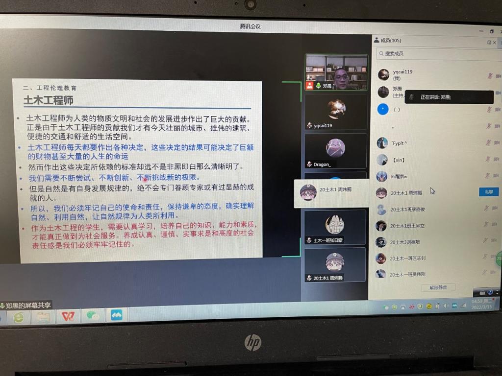 2022年3月15日,yl23455永利集团院长郑愚为2020级学生线上上“思政第一课”,上课主题为《使命、生命观与大学教育》,上课学生为2020级土木工程1-3班共112人。