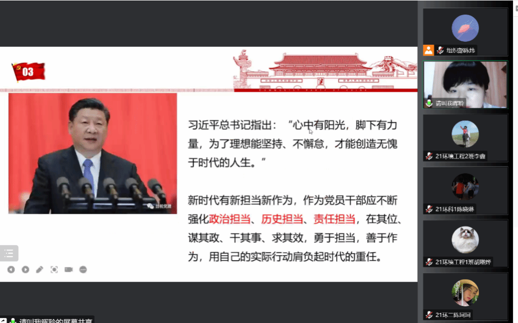 环境类培训班的张媚老师围绕我们身边的榜样、不忘初心、牢记使命三个部分展开,通过讲述在校园疫情防控中所有志愿者们奉献自己的一份力量的优秀实例,以此引出党的二十大教会我们的三个务必:务必不忘初心、牢记使命;务必谦虚谨慎、艰苦奋斗;务必敢于斗争、善于斗争。最后启示入党积极分子,考虑入党的初心,成为优秀的大学生,接受入党考验。