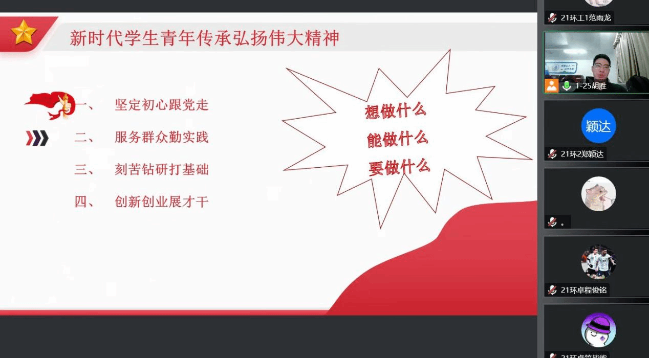 环境类党课胡胜老师围绕“中国共产党人精神谱系与新时代大学生”为主题,通过分析“共产党人的精神谱系”,“时代中产生的伟大精神”,“伟大精神的精髓要义”和“新时代学生青年传承弘扬伟大精神”四个方面层层深入,落实到新时代青年学生的成长和发展,指出新时代学生青年要传承弘扬伟大精神,要“坚定跟党走、服务群众勤实践、刻苦钻研打基础、创新创业展才干”。学习莞工之星,做好新时代青年。