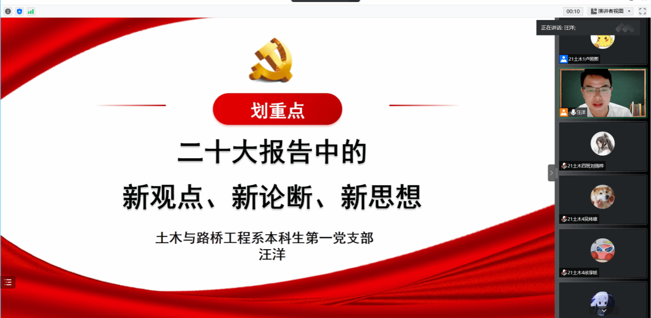 土木类党课汪洋老师以“二十大报告中的新观点、新论断、新思想”为重点,围绕大会主题、三个务必、十年来的三件大事、全面建设社会主义现代化国家、全面推进中华民族伟大复兴关键在党、“五个必由之路”、以及建设社会主义现代化国家的内在要求等六个方面给同学们深入解读二十大报告的内容。并深情寄语我们广大青年牢记:“青年强,则国家强!”努力锻炼自身本领,坚定不移听党话、跟党走,怀抱梦想又脚踏实地,敢想敢为又善作善成,立志做有理想、敢担当、能吃苦、肯奋斗的新时代好青年,让青春在全面建成社会主义现代化国家的火热实践中绽放绚丽之花。