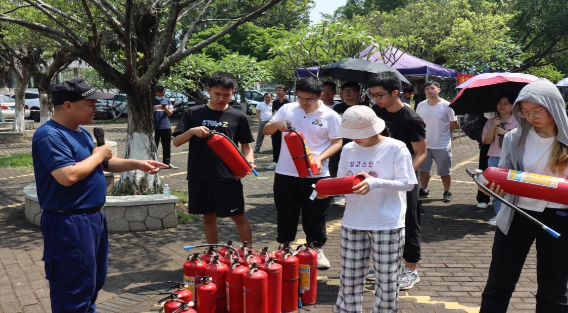 火情结束,姜因耀老师进行消防安全知识培训,重点讲解自防自救措施,示范消防自救呼吸器的使用方法,介绍常见灭火器的使用方法及注意事项等。姜老师鼓励在场所有老师和同学进行灭火实操体验,切实掌握灭火器的使用方法 。
