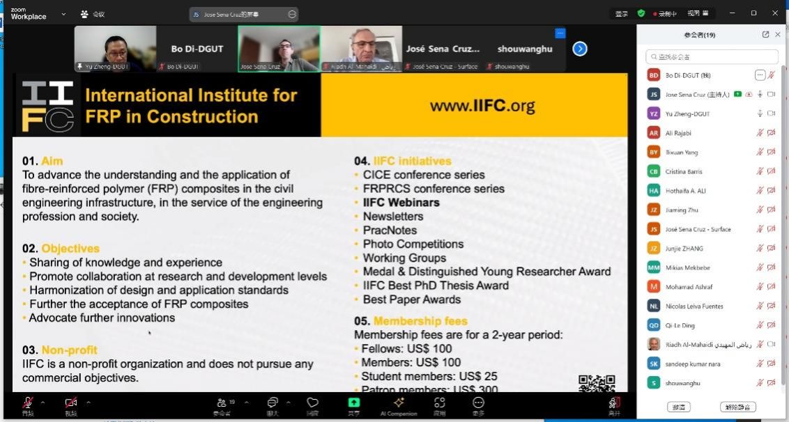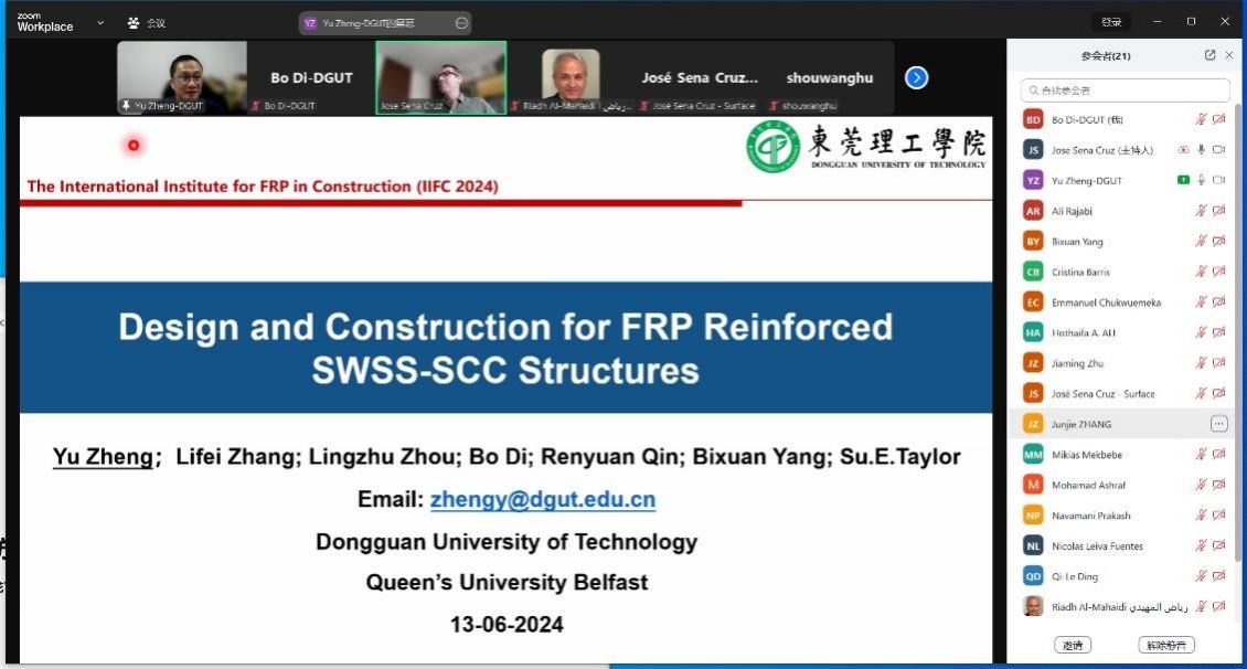 6月13日,国际土木工程纤维增强复合材料学会(International Institute for FRP in Construction, 简称IIFC)举行线上国际会议,会议邀请了全球纤维复合材料领域的顶尖专家学者参会。IIFC是唯一致力于在土建交通基础设施领域研究和应用FRP的国际专业组织,其成员代表遍及六大洲、34个国家的学术和工业界。yl23455永利集团的郑愚教授受邀参加,并在线上发表题为《Design and Construction for FRP Reinforced SWSS-SCC Structures》的研究报告,展示了其在复材增强混凝土结构研究领域的最新成果。