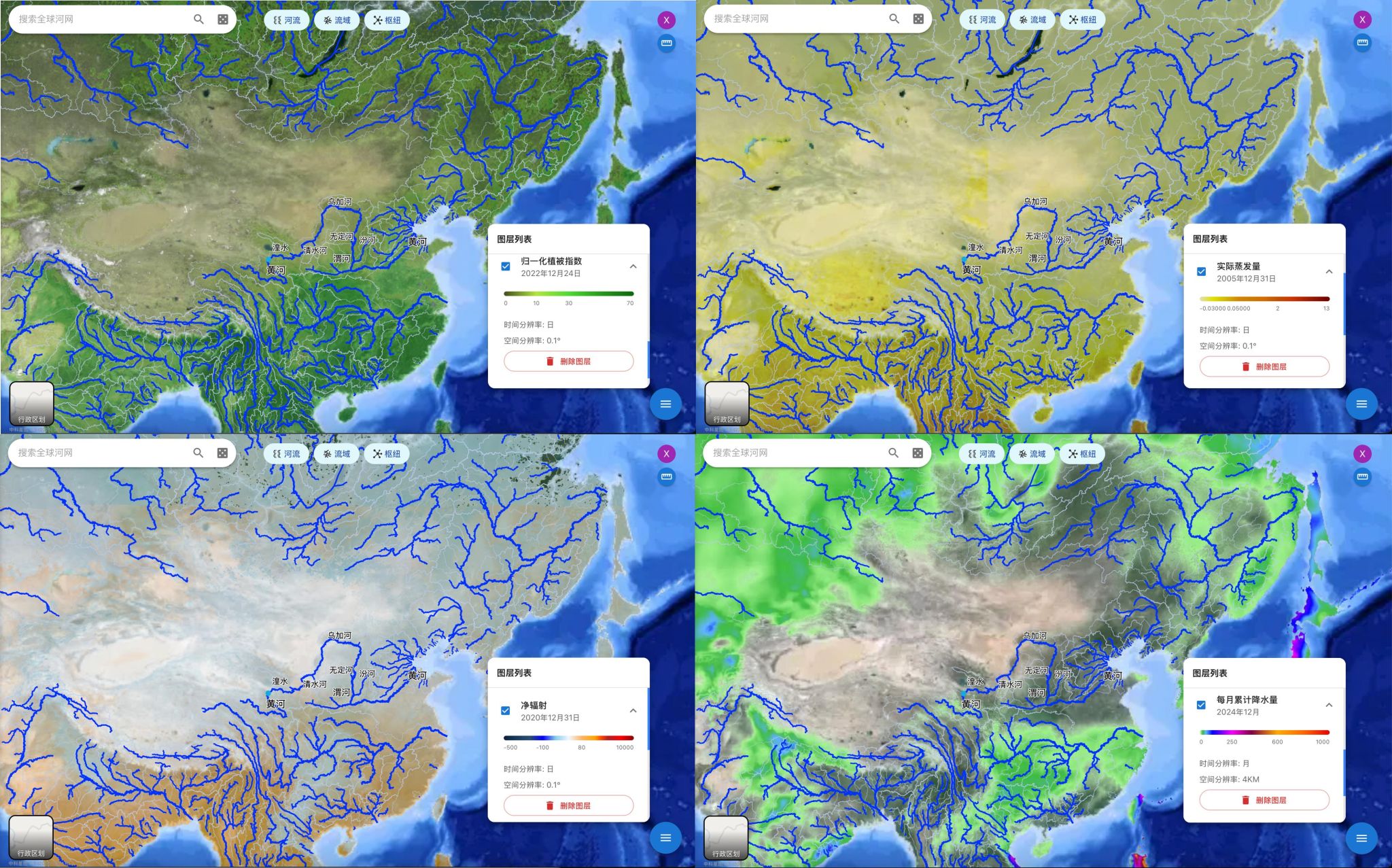 经过三年时间的系统研发、建设与迭代升级,全球河网数据平台已构建具备国际领先水平的技术方案。框架层面,平台采用当前流行的先进浏览器技术,为用户提供流畅的在线河网数据和栅格数据可视化服务;服务层面,平台在北京、东莞设立高可用服务器,并结合CDN服务,为全球使用者提供秒级响应能力;算力层面,平台自研云原生架构,为各服务提供海量存储资源和加速计算引擎,为用户提供丰富的在线计算能力。