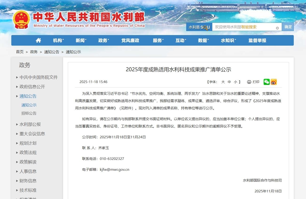 我校与清华大学合作成果入选水利部成熟适用水利科技成果名单