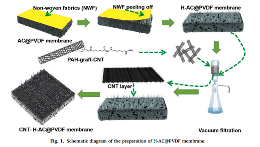 众所周知,在超滤过程中加入粉末活性炭有助于污水中微量污染物的去除,价格低廉有利于大规模处理。然而,工业废水中由于蛋白质和腐殖酸等有机物的存在,降低了微量污染物的去除效率。科研工作者结合活性碳吸附性能,将其夹在多孔的PVDF低压过滤膜中,可以很好地去除水中有机物和重金属。然而,由于有机物吸附后,粉末活性炭的加入也会加快膜的堵塞导致膜通量降低。为了解决这一问题,环建学院陈忠明博士等人通过引入PAH改性碳纳米管用于膜表面,改性后的碳纳米管具有超亲水性能超疏油性能,从而可以实现在油水分离的同时有效去除微量重金属。下图为复合膜的制备示意图。