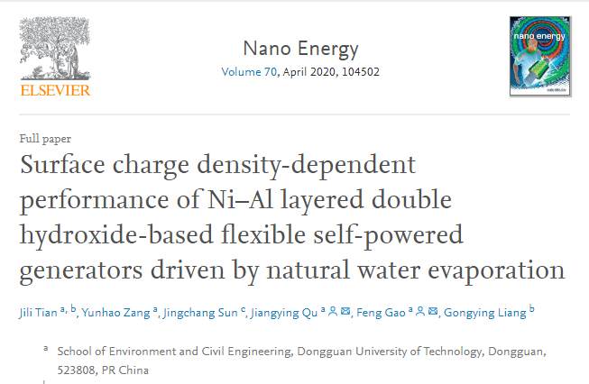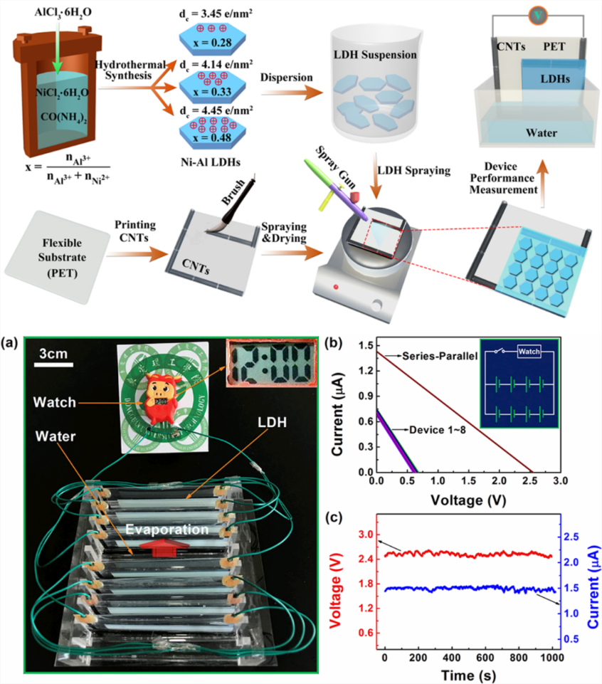 水蒸发过程蕴含巨大能量,如何将储量巨大的水蒸发能转变成可以利用的清洁电能是一项前所未有的挑战。环建学院田吉利博士后(合作导师曲江英和梁工英教授)以影响水蒸发驱动微流体发电的一个关键因素—材料表面电荷密度为切入点,精确调控Ni-Al LDHs表面电荷密度,在PET表面组装了具有高稳定性的柔性水蒸发驱动微流体发电机,首次系统研究了不同表面电荷密度对器件发电性能的影响。在此基础上,通过优化器件的结构和组装方式,利用水蒸发发电成功驱动一个儿童手表正常工作,如图所示(Nano Energy, 2020, 70: 104502,第一单位,通讯作者为曲江英教授和高峰副教授)。该成果是课题组前期工作的深化研究,前期以层状双金属氢氧化物(LDHs)为发电材料,成功构筑了水蒸发驱动的柔性发动机,实现了水蒸发能转化为电能(Nano Energy,2019, 57: 269,第二单位)。