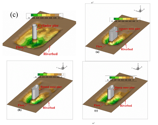 喻鹏博士基于计算流体动力学(CFD)方法,建立了局部冲刷的精细化数值模型,模拟了桥梁基础局部冲刷的物理演化过程,研究了其局部冲刷的演化规律及致灾机理。并基于湍流局部平衡假设,提出了一种新型的湍流来流边界条件和泥沙坍塌模型,大幅提高了局部冲刷的数值精度。同时还研究了桥墩形状和水流攻角等关键因素对局部冲刷的影响规律。为桥梁基础的冲刷深度预测和洪水期防灾减灾提供了重要的参考和依据。