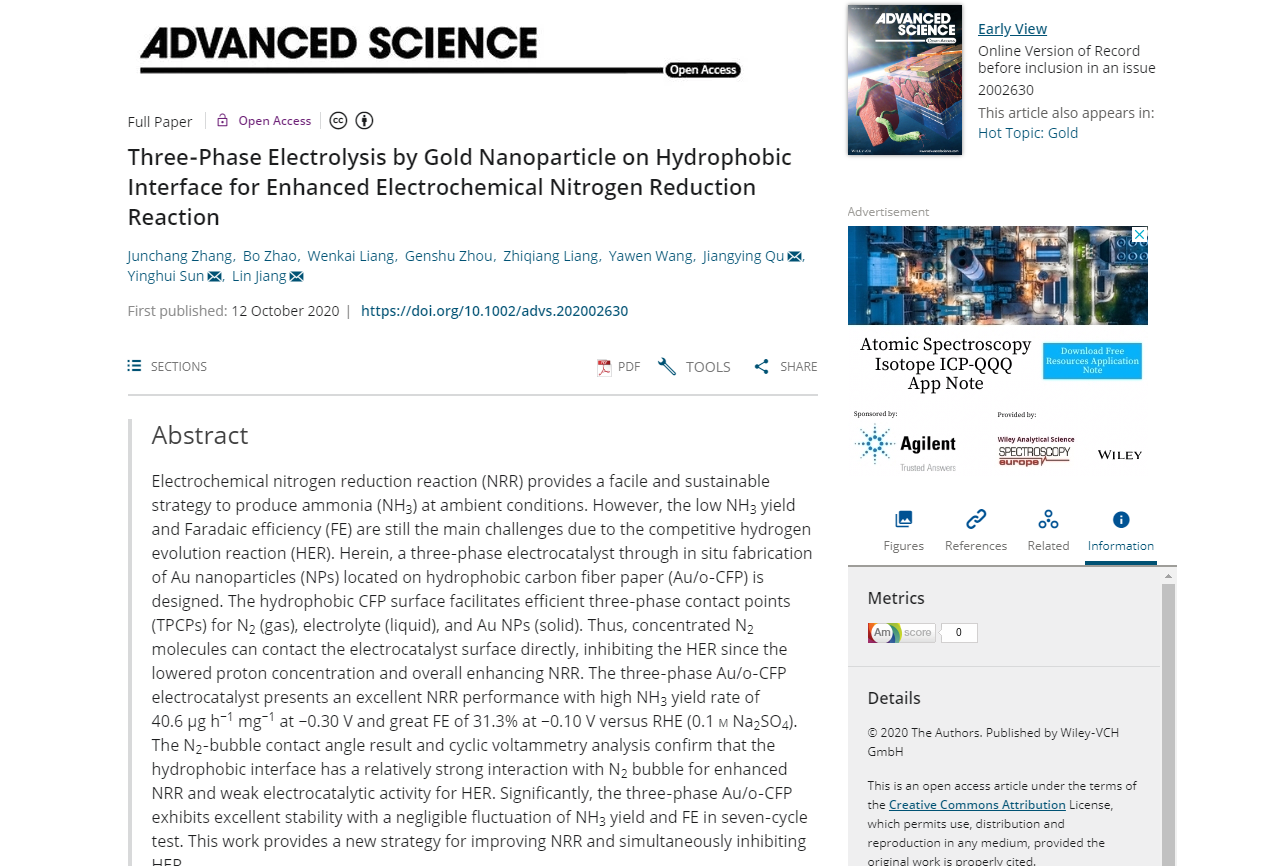 该工作以“Three‐Phase Electrolysis by Gold Nanoparticle on Hydrophobic Interface for Enhanced Electrochemical Nitrogen Reduction Reaction”为题发表在《Advanced Science》。《Advanced Science》是Wiley旗下发行的国际著名期刊,影响因子为15.8,属于中科院一区TOP期刊。该成果以yl23455永利集团为第一单位,与苏州大学合作发表。张军昌博士后为第一作者,曲江英教授与苏州大学江林教授和孙迎辉教授为共同通讯作者。文章链接:https://onlinelibrary.wiley.com/doi/10.1002/advs.202002630