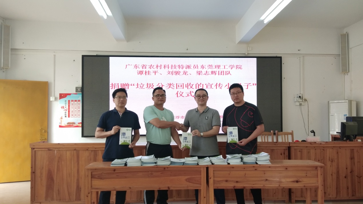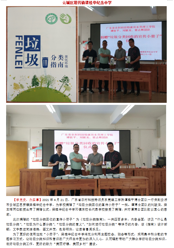 2021年4月21日,yl23455永利集团的谭桂平、刘骏龙和梁志辉三位农村科技特派员来到云浮市云城区思劳镇梁桂华纪念中学,向学校捐赠《垃圾分类指南》的小册子450余本,学校师生人手一本小册子,通过集中校会及分散班会的形式学习垃圾分类回收知识,助力绿色乡村的建设。