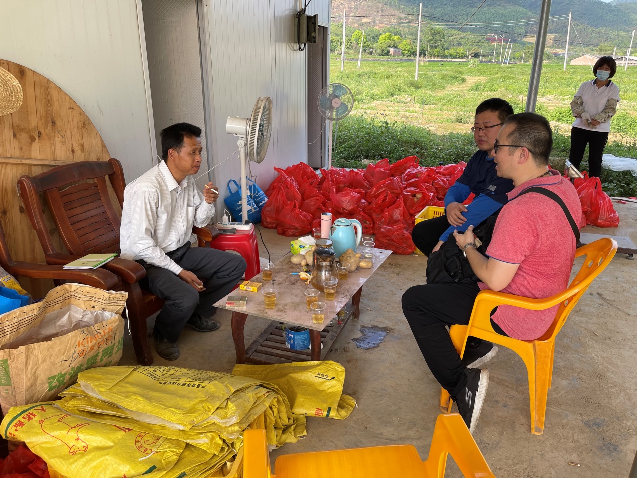 图3 农村科技特派员团队与前锋村村委黄北祥主任在田头见面,为土豆销售出谋划策。(摄影:梁志辉老师)