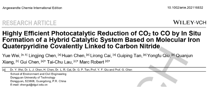 2022年1月5日,我院魏曰博士后作为第一作者,以永利y23455为第一单位,在国际顶级期刊《Angewandte Chemie International Edition》上发表题为“Highly Efficient Photocatalytic Reduction of CO2 to CO by In Situ Formation of a Hybrid Catalytic System Based on Molecular Iron Quaterpyridine Covalently Linked to Carbon Nitride”的学术论文。这是以我校为第一单位发表在《Angewandte Chemie International Edition》上的第一篇学术论文。《Angewandte Chemie International Edition》影响因子15.3,属于中科院一区顶级期刊,也是我校认定的T2类权威期刊。在该工作的基础上,魏曰博士后还成功申请到2021年度广东省基础与应用基础研究青年基金项目。魏曰博士后合作导师为邱永福教授和陈贵教授。