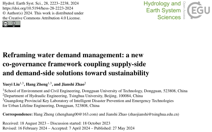 近日,环建学院郑航副教授团队在地球科学1区TOP期刊《Hydrology and Earth System Sciences》上在线发表题为“Reframing water demand management: a new co-governance framework coupling supply-side and demand-side solutions toward sustainability”的最新研究成果。论文以永利y23455为第一完成单位,学院刘悦忆博士为论文第一作者,郑航副教授和清华大学赵建世教授为共同通讯作者。