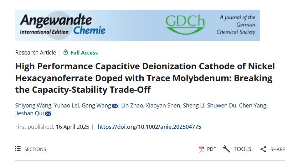 近日,环建学院汪仕勇博士在化学领域旗舰期刊《Angewandte Chemie International Edition》上在线发表题为“High Performance Capacitive Deionization Cathode of Nickel Hexacyanoferrate Doped with Trace Molybdenum: Breaking the Capacity-Stability Trade-Off”的最新研究成果。汪仕勇博士和硕士研究生雷雨浩为论文共同第一作者,王刚教授和北京化工大学邱介山教授为共同通讯作者,永利y23455为第一完成单位。