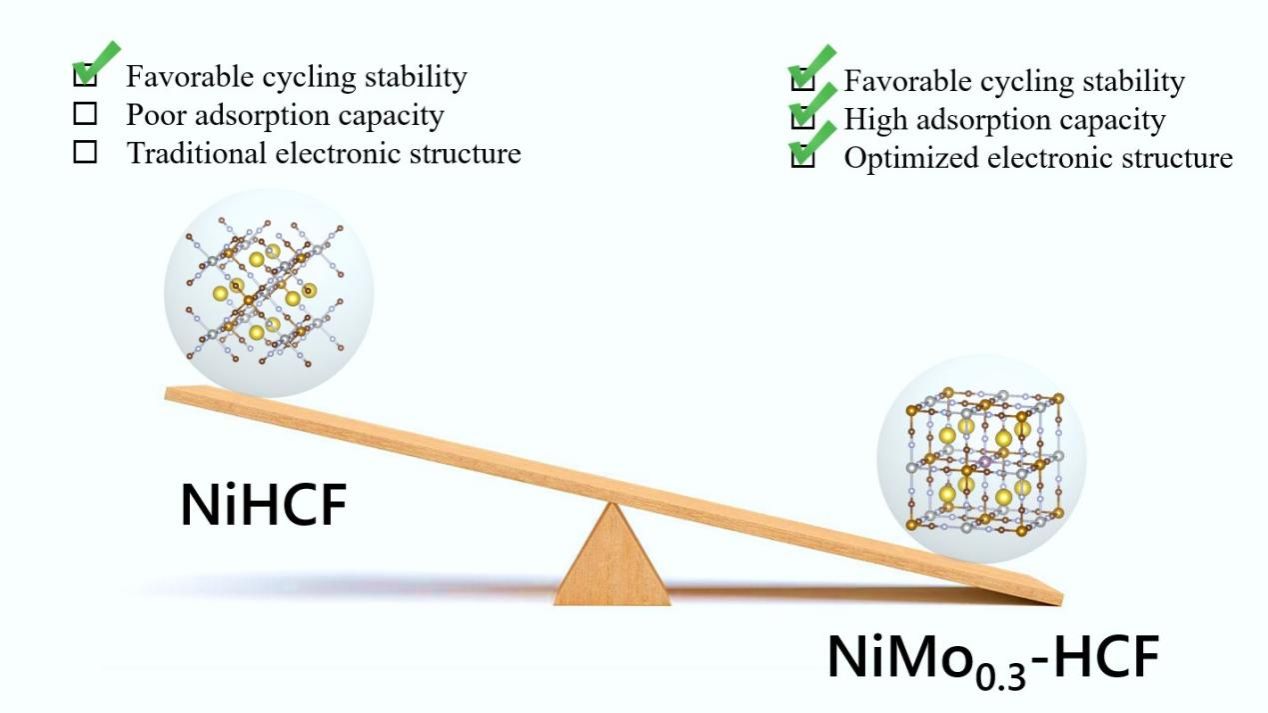 在此,作者提出了一种高价过渡金属Mo掺杂策略,利用痕量Mo6+有效激活NiHCF内的惰性位点。设计了具有多对氧化还原活性位点和长循环能力的Mo掺杂NiHCF电极(NiMo0.3-HCF),打破了高吸附容量和长循环稳定性之间的权衡。NiMo0.3-HCF利用高价金属的独特物理化学性质激活了NiHCF内部的惰性位点,优化了电子结构,并在用作CDI电极时延续了NiHCF优异的循环稳定性,表现出更高的吸附能力。这种高价金属掺杂策略为具有高结构稳定性、优脱盐性能的阴极材料的创制提供了一种新思路。