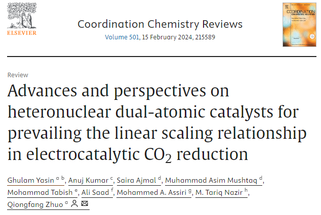 此外,Ghulam Yasin博士于2024年2月15日在国际权威期刊《Coordination Chemistry Reviews》(2024-2025最新影响因子: 23.5)发表综述文章“Advances and perspectives on heteronuclear dual-atomic catalysts for prevailing the linear scaling relationship in electrocatalytic CO2 reduction”。我校 Ghulam Yasin 博士为文章第一作者,卓琼芳博士为通讯作者,永利y23455为第一完成单位(第一通讯单位)。