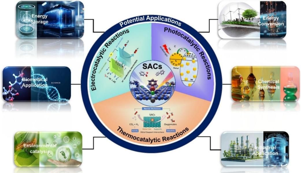 单原子催化剂(SACs)最近成为催化、能源生产和储存领域的一个革命性前沿。由于其成分多样性、结构可调性和独特的电子特性调节能力,SACs为可持续发展提供了重要的途径。本综述首先讨论了SACs的发现、合成技术、调控原子分散度、原子级分辨的高级表征、探测不同载体以及增强稳定性和反应性的工程策略。该文章综述了SACs在二氧化碳、氮气、硝酸盐的电催化和光催化还原中的催化潜力,在金属-氧、锂-硫和金属-CO2电池等储能技术中的显著贡献。此外,还概述了SACs在各种热催化过程中的研究,包括氮氧化物去除、加氢过程、催化氧化和二氧化碳加氢,特别揭示了其复杂的结构-活性关系。最后,文章总结了SACs在能源转换、储存和环境应用中面临的挑战。本综述聚焦SACs领域重大进展,展现其在能源转化存储与环境治理催化应用中的广阔前景。