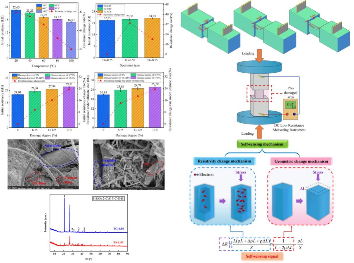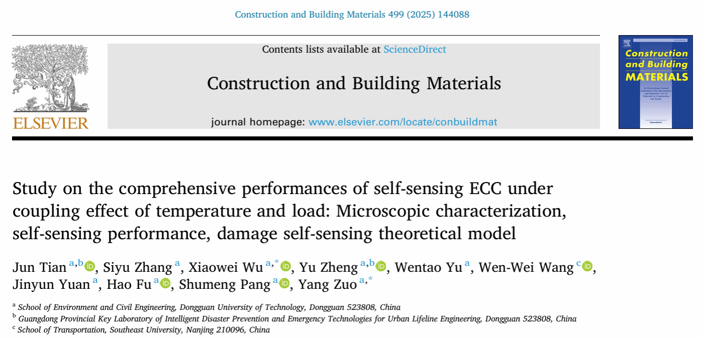 近日,田俊特聘教授、郑愚副校长、袁锦昀院士等人在工程技术领域TOP期刊《Construction and Building Materials》发表了题为Study on the comprehensive performances of self-sensing ECC under coupling effect of temperature and load: Microscopic characterization, self-sensing performance, damage self-sensing theoretical model的研究论文。我校田俊特聘教授为论文的第一作者,硕士研究生章思宇为论文的第二作者,永利y23455为论文第一完成单位和通讯单位