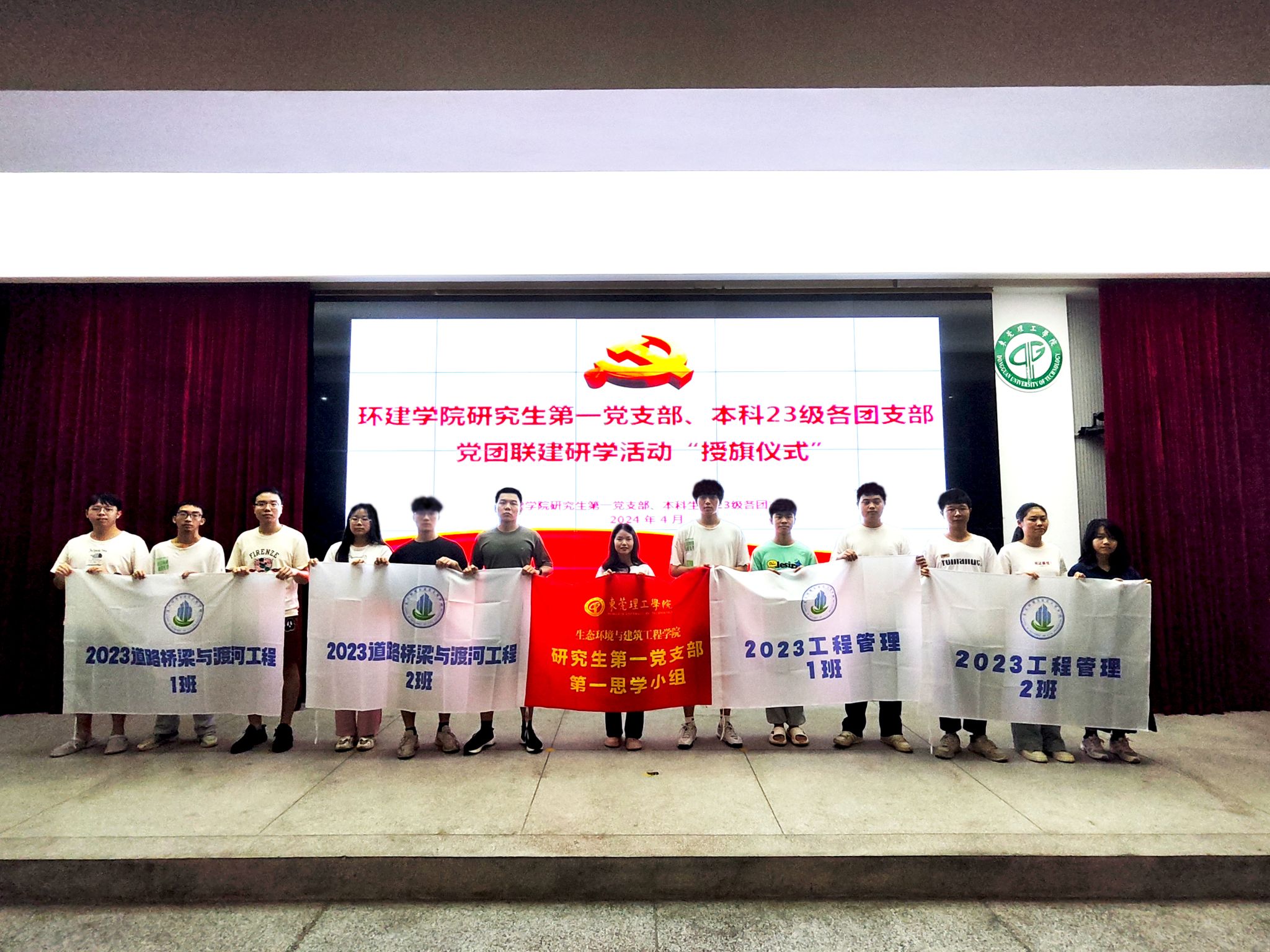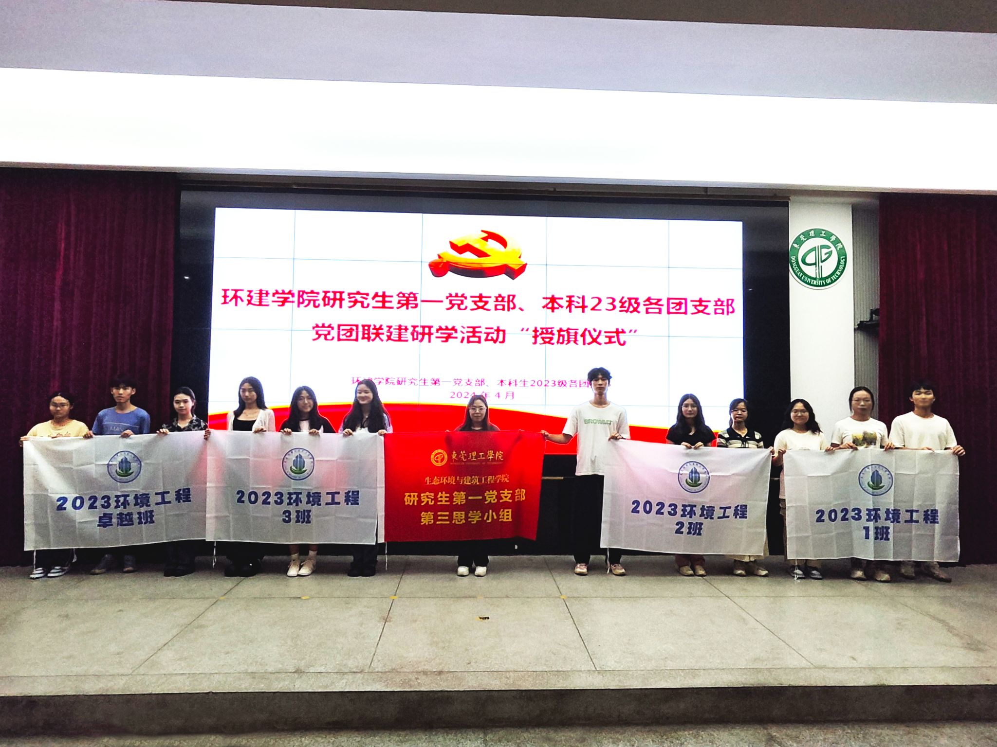 接下来,会议进入第二项议程,“党团联建研学活动授旗仪式”。此前,环建学院研究生第一党支部在4月18日召开了“党团联建研学活动启动仪式”;为使活动更好地开展,并注入更多活力,支部研究生党员代表提议在本次会议中加入此次党团联建活动的授旗仪式,使得活动氛围、活动导向更加振奋人心。