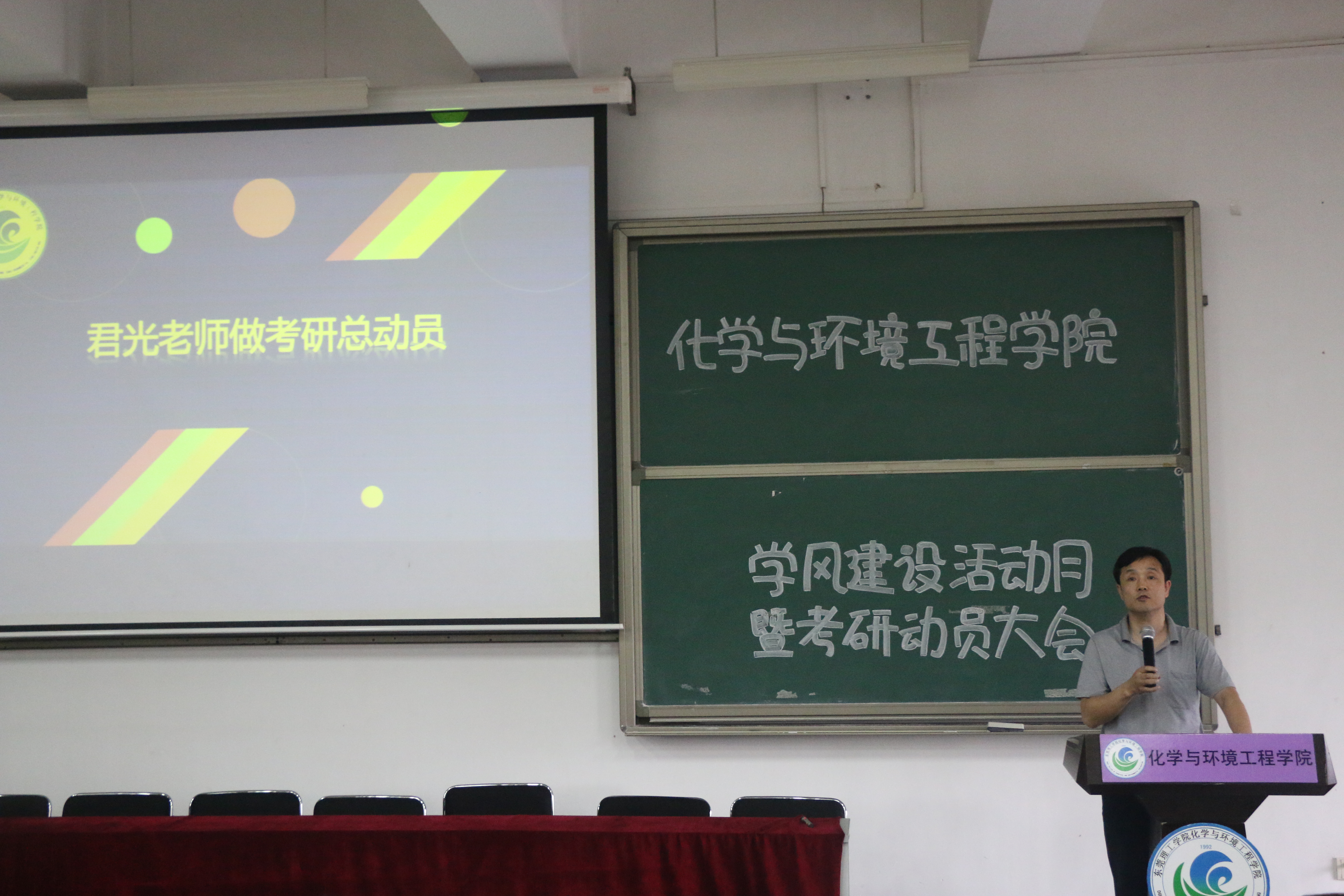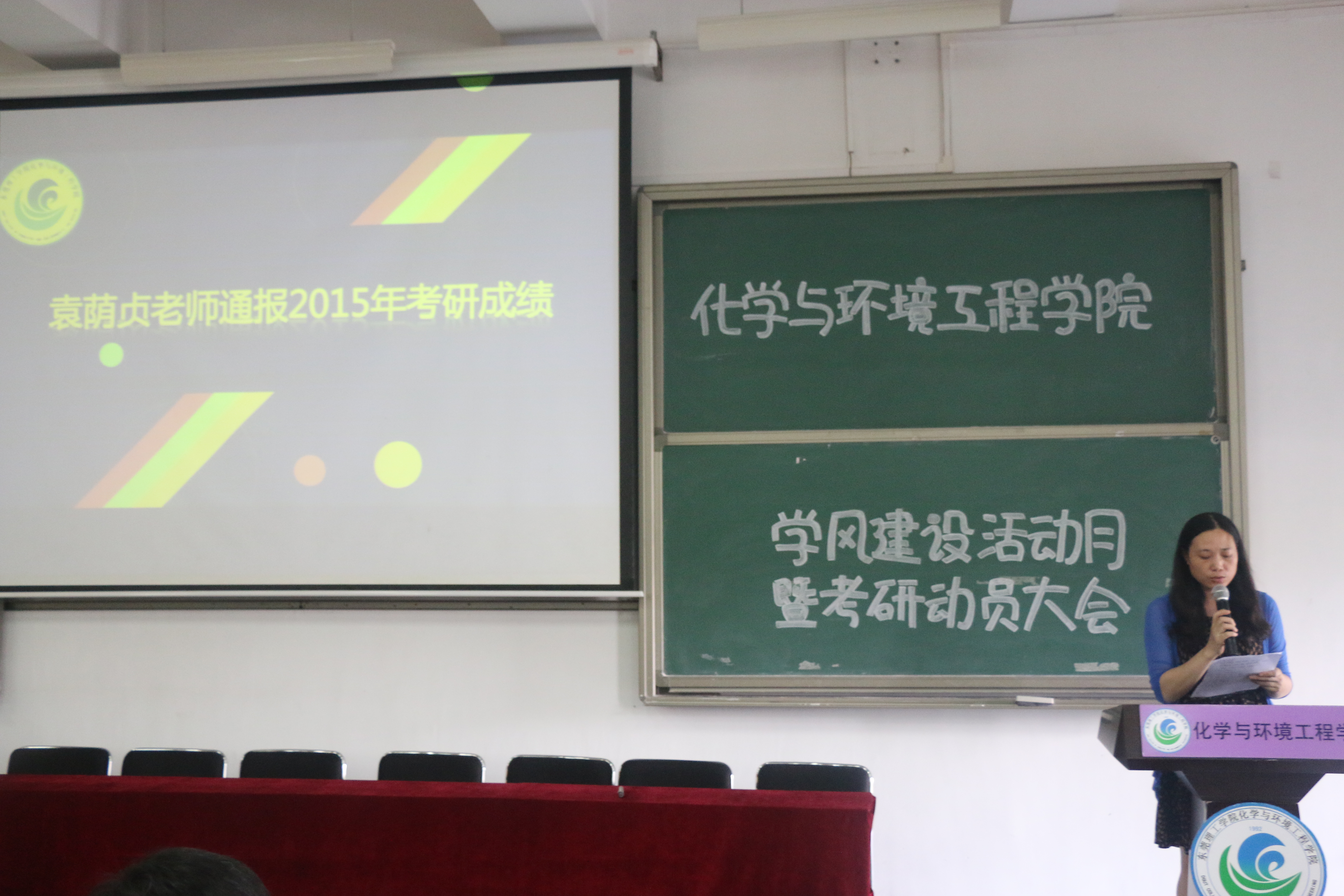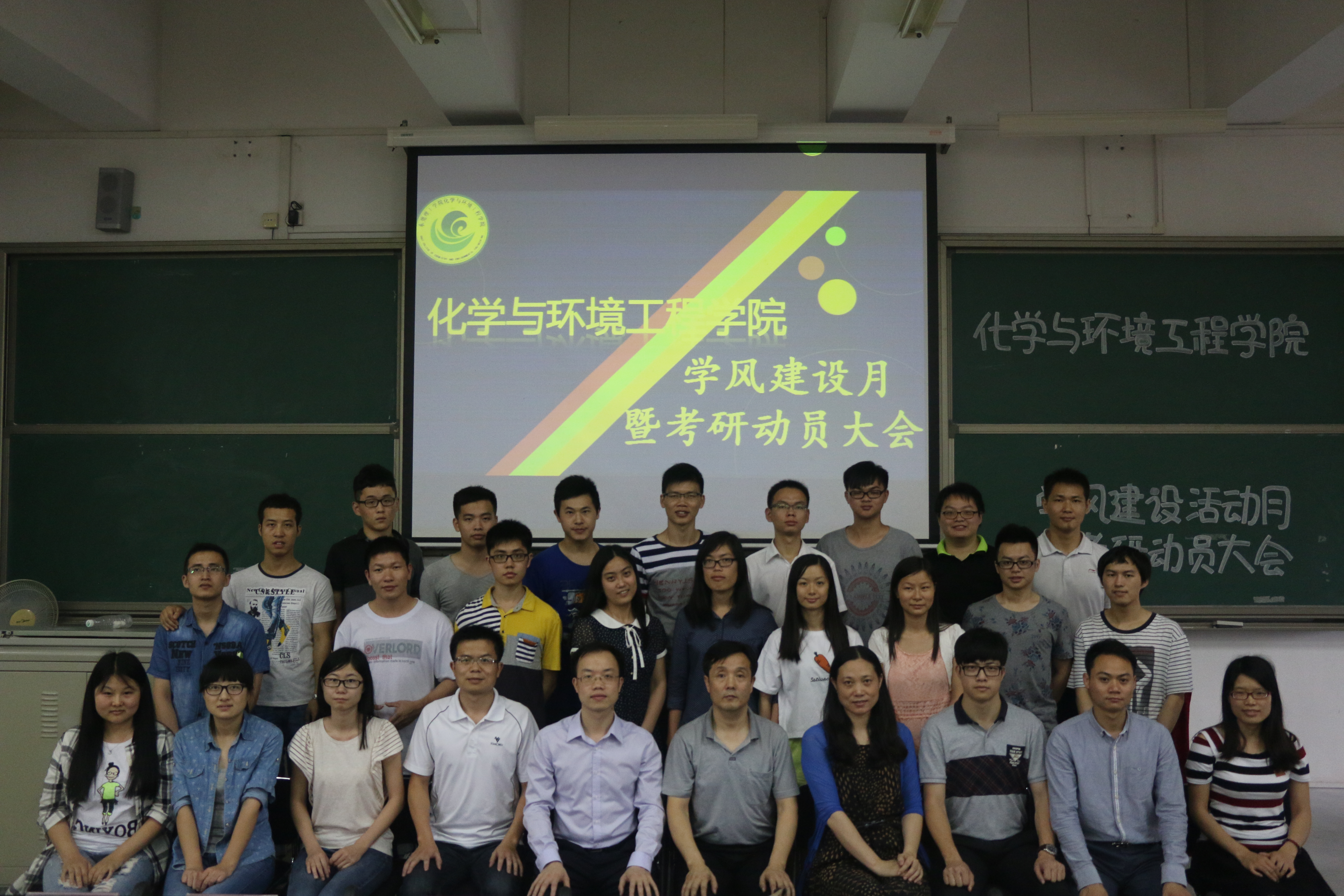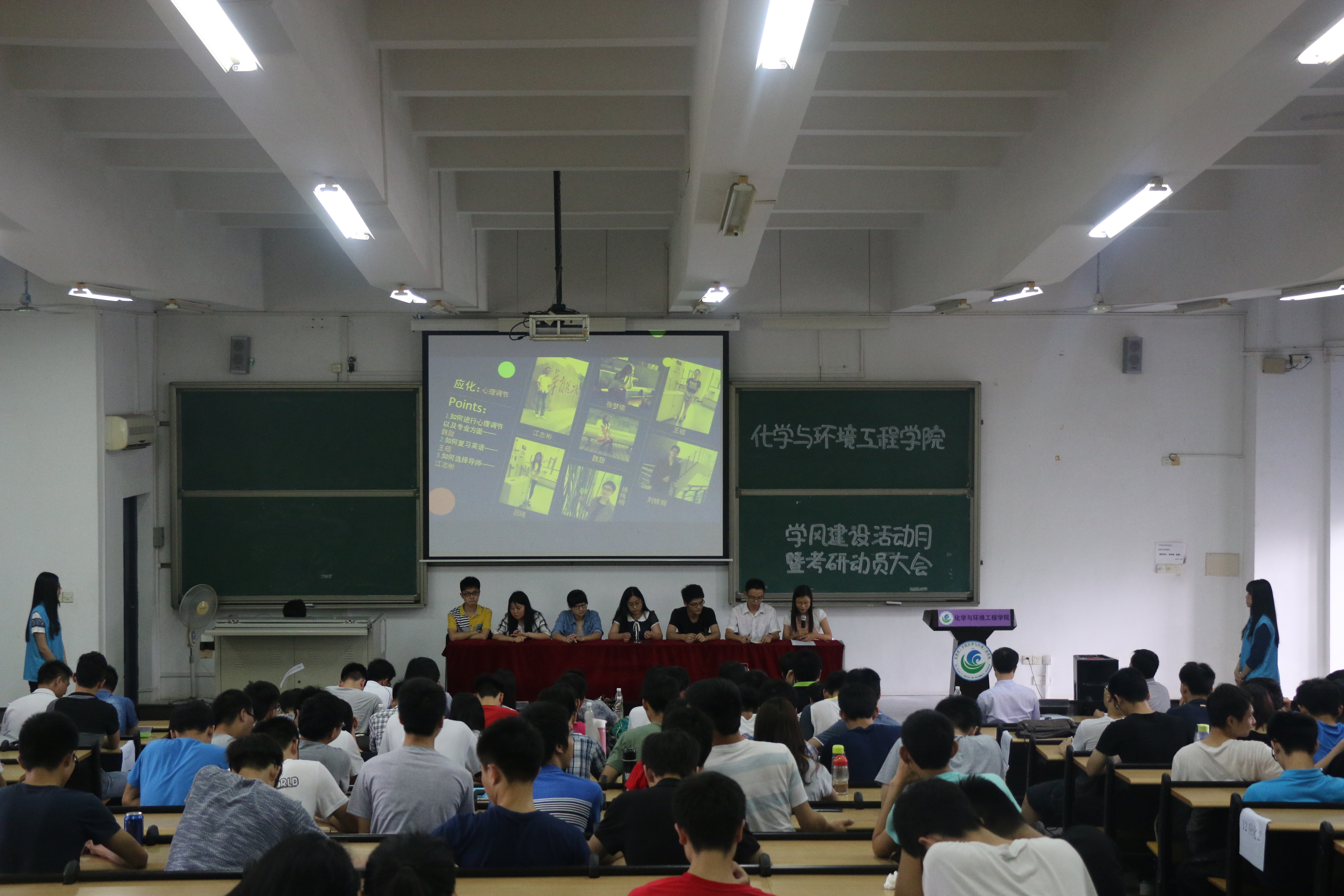 2015年5月7日,环建学院学风建设活动月暨考研动员大会在松山湖校区教学楼6E207顺利召开。出席本次会议的嘉宾有学生处处长路晓军教授,环建学院党总支书记君光老师,副书记袁荫贞老师,黄相璇博士,谢锐浩、王欢师兄。另外,与会人员还有2015年多名成功考研的学生以及大三全体学生。