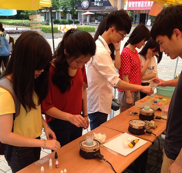 其中手工香皂DIY是最受同学们欢迎的。值得一提的是,香皂的水晶皂基由工作人员于实验室中用植物油、氢氧化钠等材料亲手制作。经过了皂基切块融化、加色素或香精、倒模、脱模这几个步骤,很快,一块块精致逸香的香皂便呈现在众人眼前。另一个令人耳目一新的是活动展览牌上的大树的绿叶子,那是先将废纸制成再生纸,再经过裁剪、染绿而成,最后这些绿叶子上是承载着同学们对环保活动的建议和祝福语被粘在展览墙上。当然其他摊位上的寝室门牌DIY、环保盆栽DIY也各具特色,纷纷获得同学们的支持。
