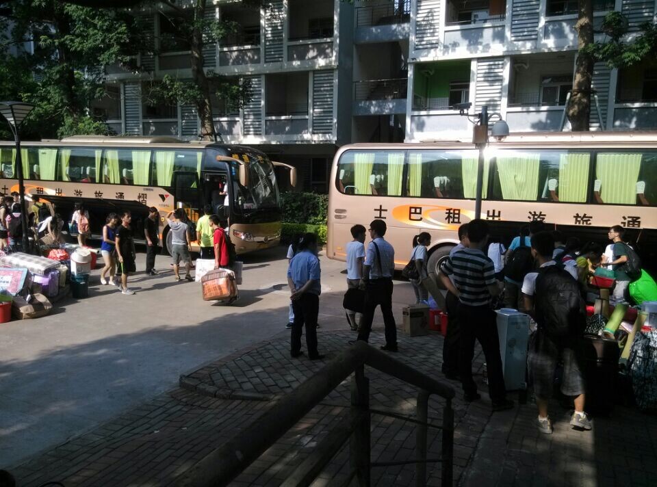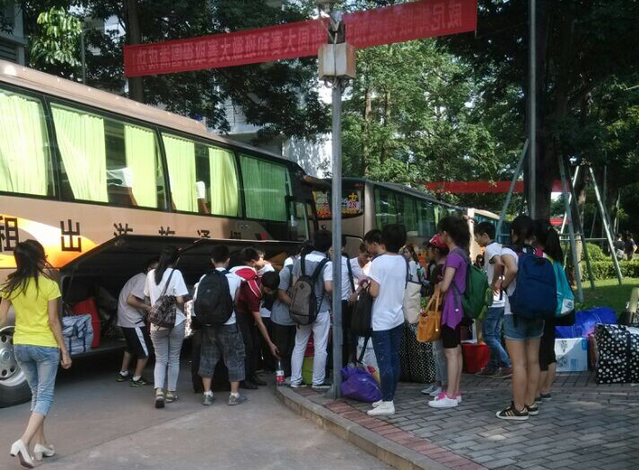 下午15:00,行李装车工作已完成。近一个小时的车程后,大巴抵达松山湖校区。辅导员文锦枢、陈泳源,罗文旺到现场迎接大一学生并指挥搬运工作。首先,男同学帮女同学把行李送到女生宿舍,然后再将自身行李运回宿舍。行李搬运过程中,不少志愿者积极投入工作,使繁重的搬迁任务变轻松。
