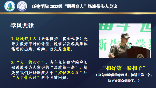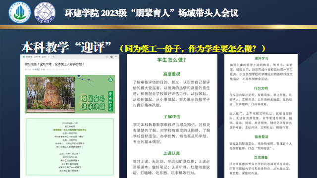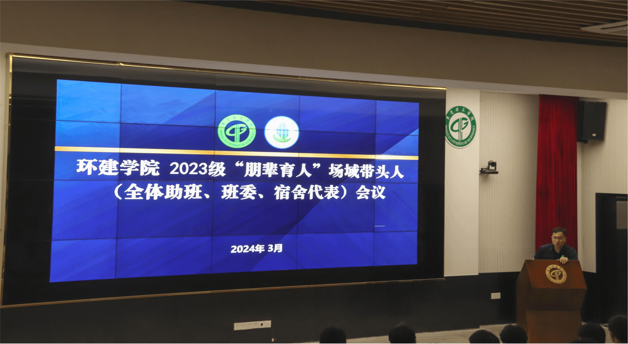 为夯实2023级新生“朋辈育人”主体力量,充分发挥“朋辈”力量在新生教育各场域的引航作用。2024年3月31日,环建学院组织召开新学期2023级“朋辈育人”场域带头人3月全体会议,23级新生助班、全体班委、宿舍代表(宿舍长)等170余人(占学院23级全体学生人数的50%,学生所在社区宿舍全覆盖)参加;会议由学院2023级政治辅导员李春志老师主持。