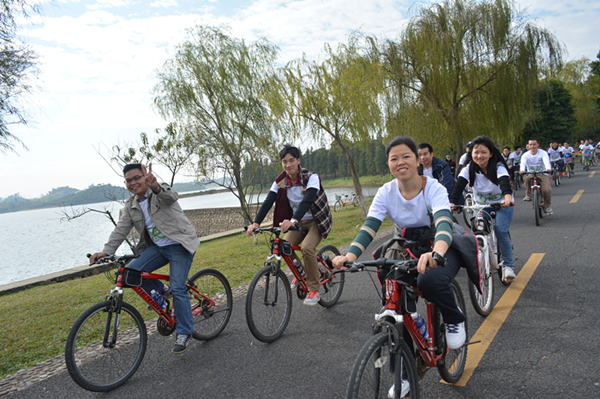 9点半时,在环教队队员杨建强、吴伟锋的带领下,全体活动人员排成两列,从滨湖路西路口出发开始环湖骑行并进行环保宣传。“快乐骑行,绿色出行”的旗帜,骑行队伍有条不紊、井然有序前进,宣传效果可见一斑。骑行队伍依次经过滨湖路西、阳光沙滩、跑马场、桃源公园、松湖花海,最后回到滨湖路西,中间设立两个休息点,利用休息时间向路人讲述此次活动的意义。12点30分,骑行队伍一行人顺利到达终点。环教队队长陈春莉作出活动总结,至此,本次骑行活动圆满落幕。