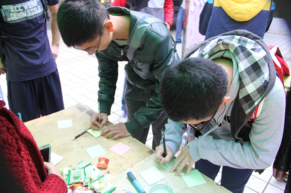 活动第一阶段,在采集心愿的活动中,由该团支部团员青年们热情向路人宣传,不论是教师,同学抑或是孩童,无一不被吸引,外教Aden也写下了属于他的心愿,可见,即使是异国人,走下网络,走进“心灵驿站”,也可实现零距离交流;之后,由该团支部宣传小组人员引领路人走进“心灵驿站”并写下他们的心愿,在“心愿墙”上贴上属于他们或者她们的“心愿贴”,跨越展现的“男生墙”和“女生墙”被贴满,满墙的心愿在太阳下闪动着,等待实现。