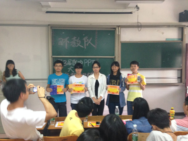 2014年11月2日,永利y23455化学与环境工程学院环保宣传教育志愿服务队(简称环教队)在莞城校区教学楼1308课室举行了第三届队内PPT大赛,到场的嘉宾有前任部长叶艳琴、陈亚松,2010届环教队队员张裕航、谢璐霞,部分2012届队员,现任部长与副部以及2014级全体干事。