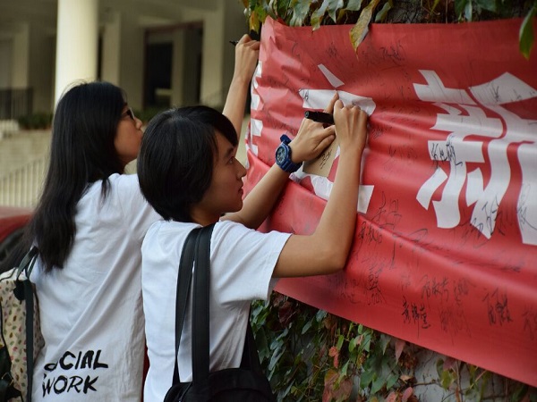 交流会期间该团支部成员向参与交流会的路人派发DIY明信片,团员青年在横幅——“平等之新见上留下签名。
