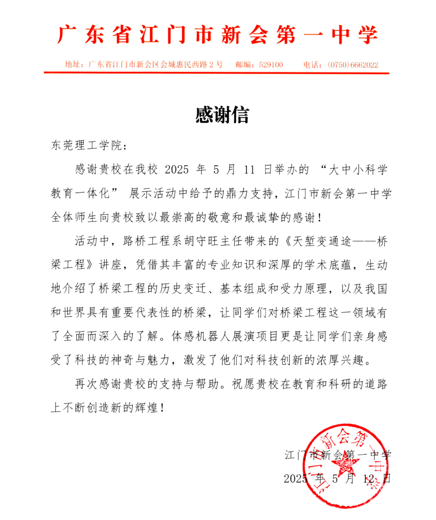 上午,环建学院路桥工程系主任胡守旺老师在新会一中举办了题为《天堑变通途——桥梁工程》的讲座,向师生们介绍了桥梁工程的历史变迁、基本组成和受力原理,激发了学生们对桥梁相关学科领域的兴趣;环建学院臧云浩老师协助电智学院赖树明老师开展“体感机器人”展演,向高中生展示了科技的神奇与魅力。次日,新会一中专门致信学校感谢此次走访老师们的辛勤付出,尤其是为高中学子带来的专业学科领域科技创新意识方面的激发。