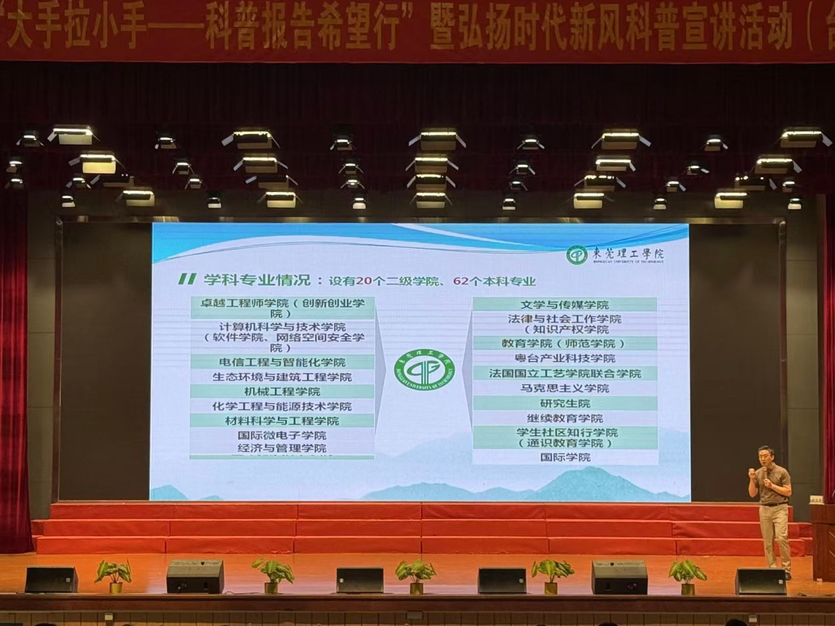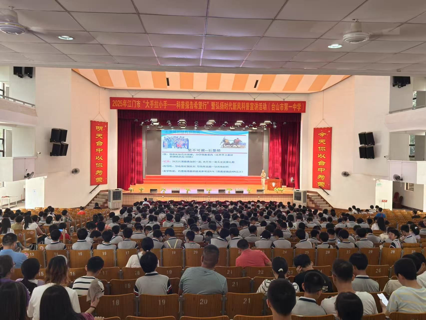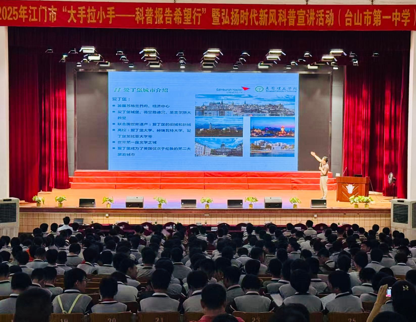 6月15日,“台山市少年科学院2025年科技节”活动在江门市台山一中举行,由环建学院高峰副院长带队,左洋博士、李宁博士,以及束雨轩和钟兆丰两位研究生,组成环建学院招生宣传走访队伍,为江门市台山一中的学子和家长带来通识课讲座、科技成果展演、国际化培养项目推广、招生咨询服务等多形式的“高校文化进中学”活动。