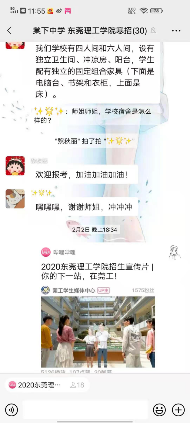 寒招队员线上发送视频等相关资料,向学子们介绍学校的基本情况,包括学校的地理位置,建设现状,学科专业,师资力量,科研情况等。同时也对家长关心的人才培养模式,毕业后的就业前景,广东省的招生政策和我校今年的招生新变化进行详细地讲解。在宣传过程中,寒招队员耐心解答考生们关心专业和社团活动的问题。学子们通过寒招队员的讲解和答疑,对永利y23455也有基本的了解。
