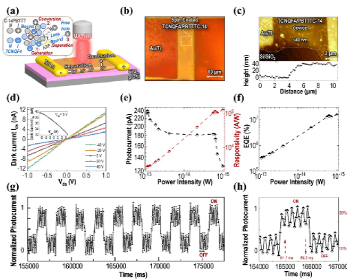 图1. 1.0μm时,TCNQF4/C14-PBTTT的微观性能和光电性能分析