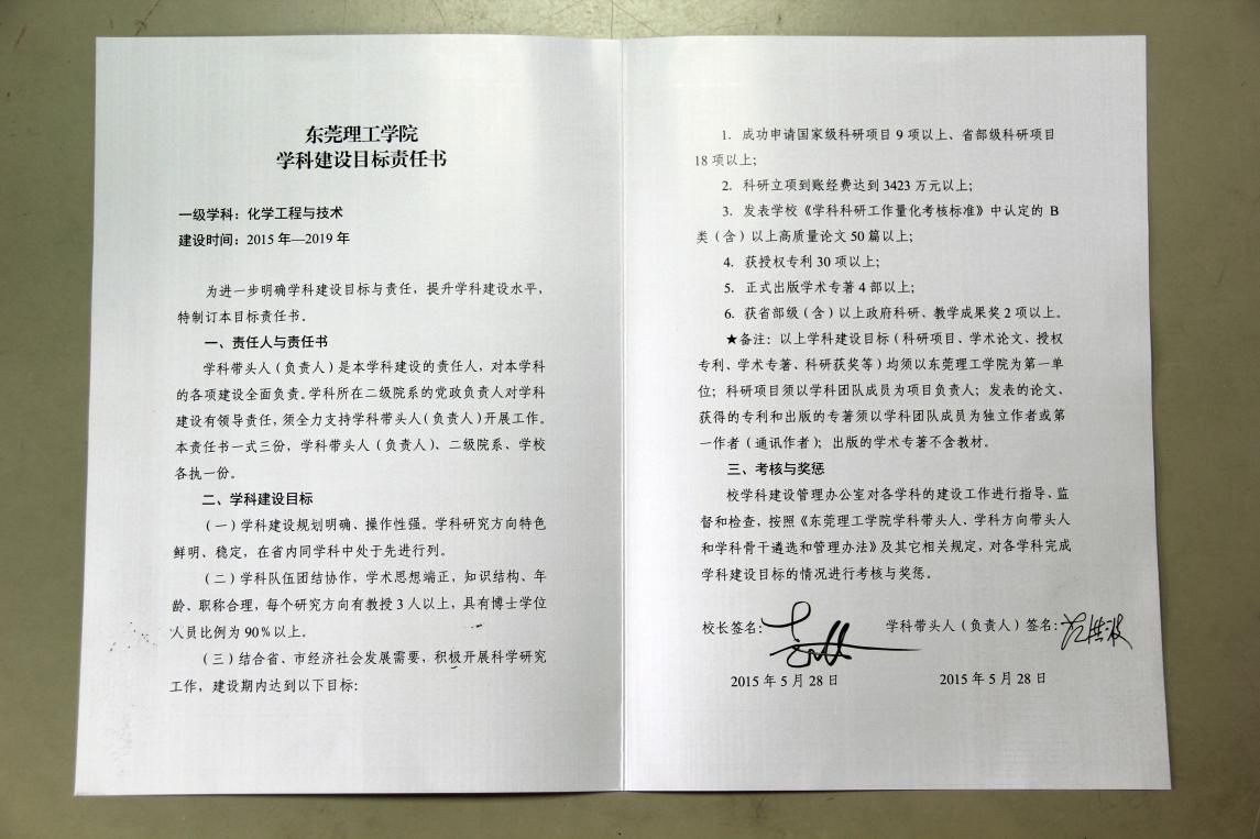 我院与学校签订的目标责任书包括十方面的内容:领导班子建设、人才培养工作、科学研究和社会服务工作、师资队伍建设工作、学科专业建设工作、实验室的建设工作、国际交流与合作工作、党建与思想政治工作、管理制度建设工作、特色项目,建设时间为2015年-2019年。其中,学校下达给我院的科研立项到账经费任务在全校二级教学单位同比排名第一。接下来的4年里,我院党政领导班子按照学校的要求把本单位的目标任务按年度分解实施,全体化环人将按照既定目标努力使我院的科研教学及各项工作迈上一个新台阶。
