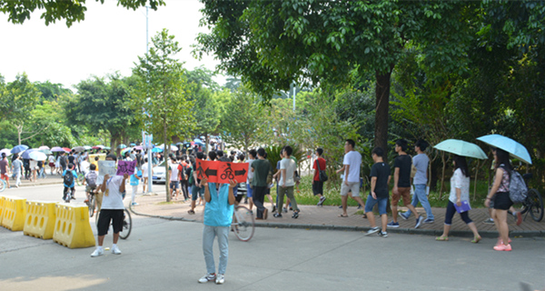 每天中午13点40分,各位志愿者准时在一期饭堂门前集合,待负责人分发好指示牌、标语后,大家迅速找到自己的位置,示意行人已把道路分成人行道和自行车道。路过的车辆、行人自觉按照志愿者们的指示分成两边行走,志愿者们随机应变,及时调整位置。当看到混乱的人群和车辆在清晰明了的指引下,变得井然有序,志愿者们脸上都露出欣慰的笑容。