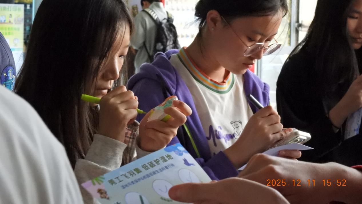 除了干货满满的科普宣讲,现场设置的沉浸式游园趣味环节更是点燃了同学们的参与热情。鸟类图鉴“极速抢答”考验大家对鸟类知识的快速反应与记忆;鸟鸣盲听“声纹识鸟”让同学们闭上眼睛,通过分辨不同鸟类的鸣叫声感受自然韵律;鸟类拼图“拼速大作战”在动手动脑中加深对鸟类外形的认知;迁徙路线“快闪冲锋”让同学们在模拟迁徙过程中体会鸟类生存的不易;护鸟行动“创意涂鸦”则为同学们提供了表达生态愿景的平台,大家用画笔勾勒心中的护鸟场景、低碳生活蓝图。每个环节都人气高涨,同学们在轻松愉悦的互动中近距离感受鸟类魅力,深化对湿地保护、生态平衡的理解,将“爱护鸟类、践行低碳”的理念内化于心。