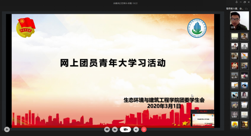 团委书记汪洋与环建团学骨干、学生干部在企业微信开展线上视频学习活动。在会议上,汪洋老师与团委学生会干部分享几点主要内容:学习共青团中央关于深入学习贯彻习近平总书记重要讲话精神,发挥共青团生力军和突击队的作用;作为团员青年,要积极参与线上应援,做力所能及的志愿活动,在社区中发光发热;做好疫区青年的帮扶工作;做好思想政治工作,广泛宣传中国特色社会主义制度的优势;推动好青年就业和创新创业工作。同时,要求青年大学习的学习通知及时下达到各班团支部,并组织全体学生开展线上学习活动。