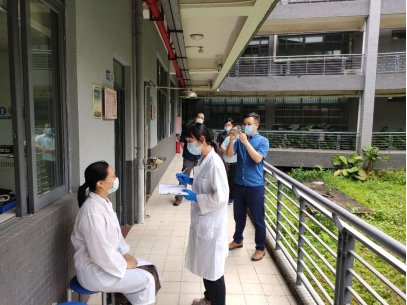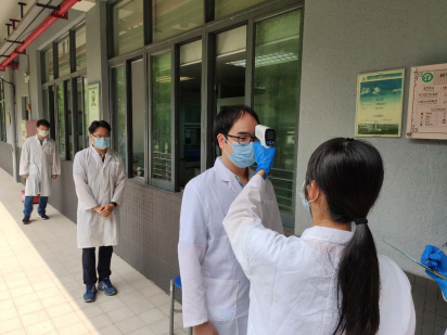 在12K102组织实验老师开展实验室疫情防控流程及突发情况演练,演练现场由老师扮演学生角色。进入实验室前,进行体温测量及双手消毒;实验教学过程中,有学生报告身体不舒服,实验老师启动疫情应急预案,按照应急指引文件,把学生带离课室并重新测量体温,询问14天内旅居史,按要求上报疫情防控应急组和联络员;安抚其余学生情绪,在课室原地待命,重新测量体温。辅导员第一时间赶到现场,登记学生信息,同时等候疫情防控办指令。
