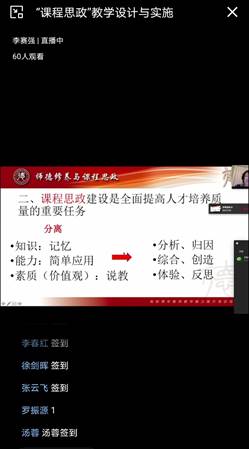 本次活动首先邀请了山东大学知名专家李赛强教授开展了“课程思政教学设计与实施”的专题直播讲座,环建学院院、系相关负责人在会议室参会,专任教师60多人通过企业微信群线上参加了学习。