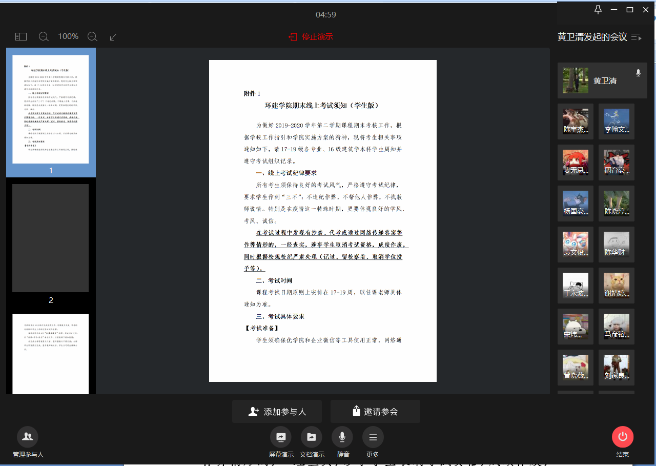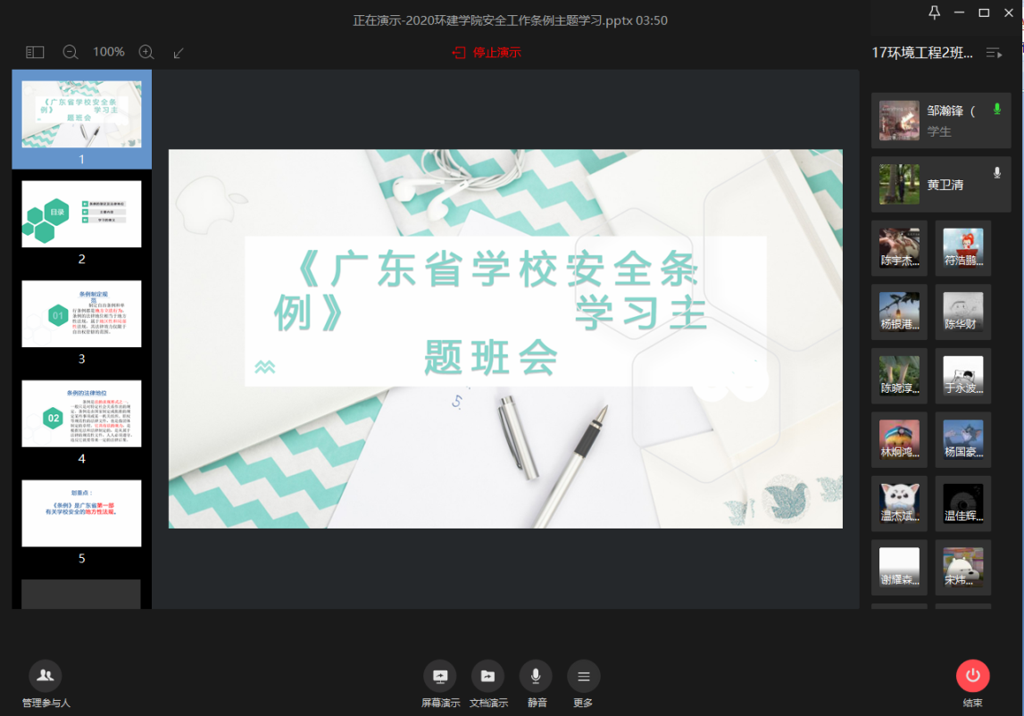 此次学期末主题班会,学院共动员了33个班级的班主任和学生参与了主题班会。此次期末主题班会就期末考风考纪问题,“三全育人”建设一流本科教育教学大讨论,线上考试注意事项,学业预警及学业困难帮扶工作,资助贷事宜,学生考研相关事宜,心理健康工作,互联网+的推进工作,广东省学校安全学习条例等相关内容开展主题班会。