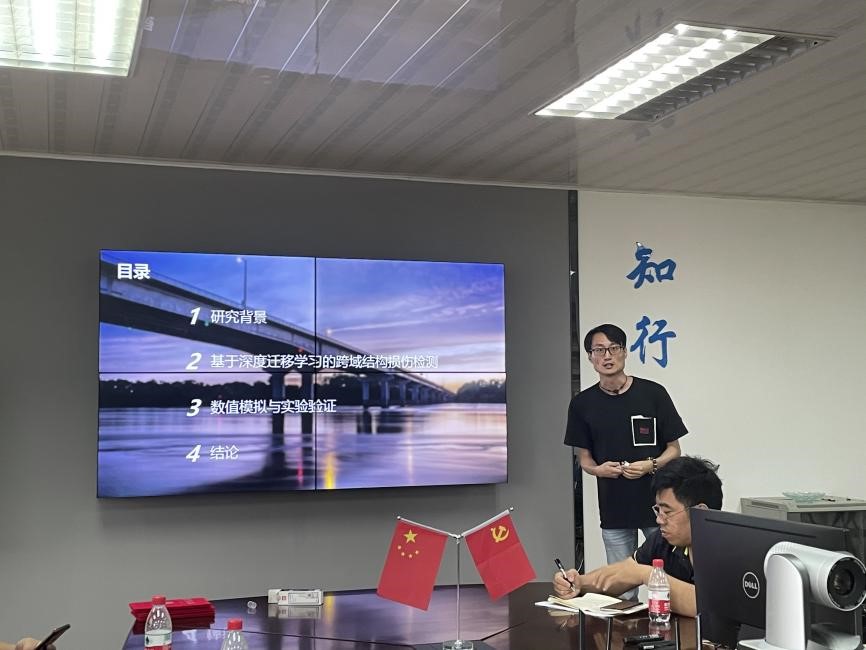 最后,我院林逸洲博士后做了题为“从数值模型到真实结构:基于迁移学习的跨域结构损伤检测”的主题报告。报告针对结构健康监测领域中数值模型与真实结构之间的差距,提出了一种基于域适应深层神经网络的跨域结构损伤检测方法,同时也设计了实验室试验用来验证方法的有效性。