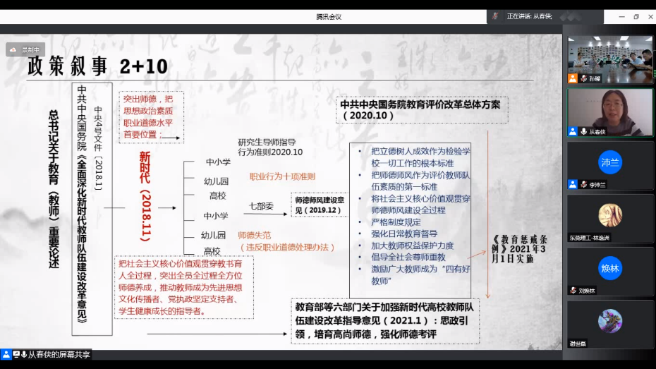 教师应肩负主体责任,承担立德树人的根本任务。从教授带领教师们仔细解读了《深化新时代教育评价改革总体方案》《新时代高校教师职业行为十项准则》等多项政策文件,针对师风师德,梳理出较为完善的政策体系,帮助教师们理清内在逻辑。