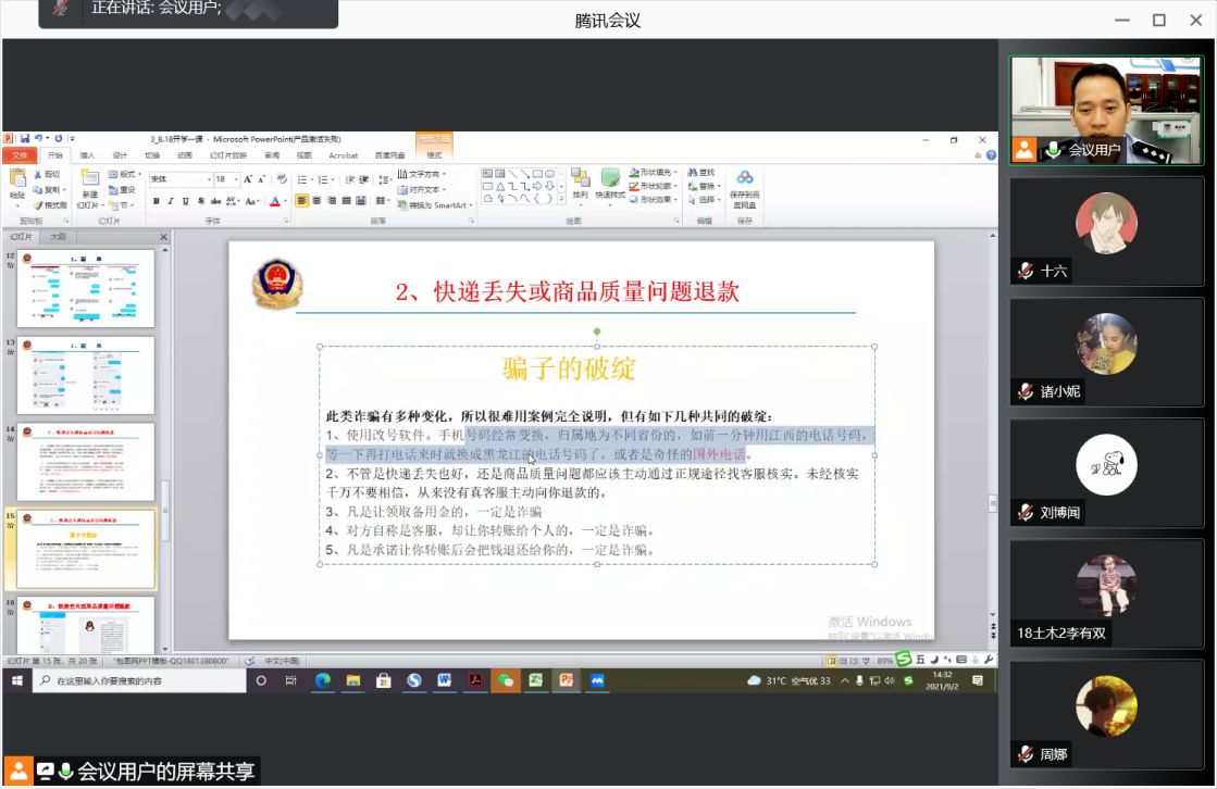 会议伊始苏东阳警官强调各位学生务必下载国家反诈中心app,以预防诈骗事件的发生。苏东阳警官就最近的一次诈骗事件来展开本次的宣讲。首先苏警官向我们讲述如何快速识别电信诈骗并列举了一系列骗子术语以此来提醒我们防止上当受骗。随后通过列举刷单、快递丢失或商品质量问题退款、注销会员等常见案例为我们详细讲解这些诈骗行为并且教授我们如何去防范这些行为的发生。