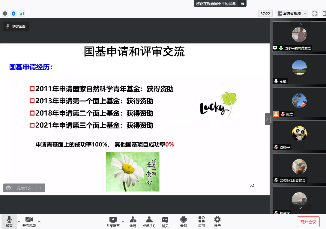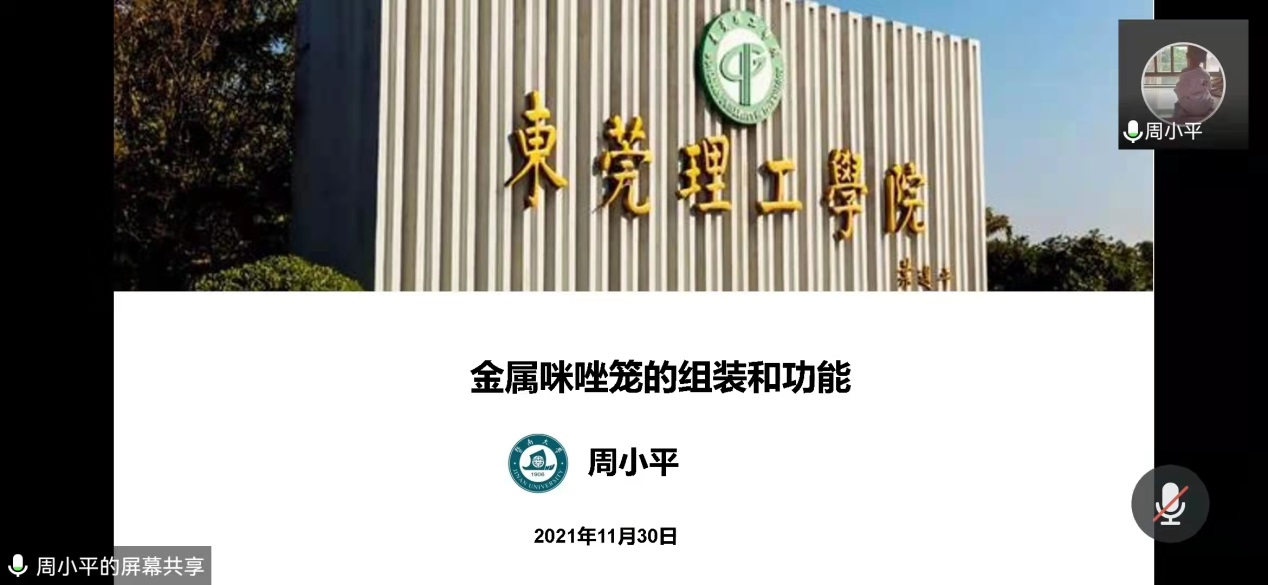 2021年11月30日,暨南大学化学与材料学院副院长周小平教授应邀为我院师生做了题为“金属咪唑笼的组装与功能”的线上报告。在报告中,周教授为我们介绍了金属有机笼的合成方法及性质特点,并重点介绍了该类化合物作为类芬顿光催化剂,用来高效降解罗丹明B的应用。学术报告结束后,周教授以国家自然科学基金项目申请人的身份,与大家分享了申请国基的经验,另外还以国基评审人的角色,介绍了国基申报书存在的一些通病,让大家引以为戒。学术交流及经验分享会的气氛热烈,收到了很好的效果。